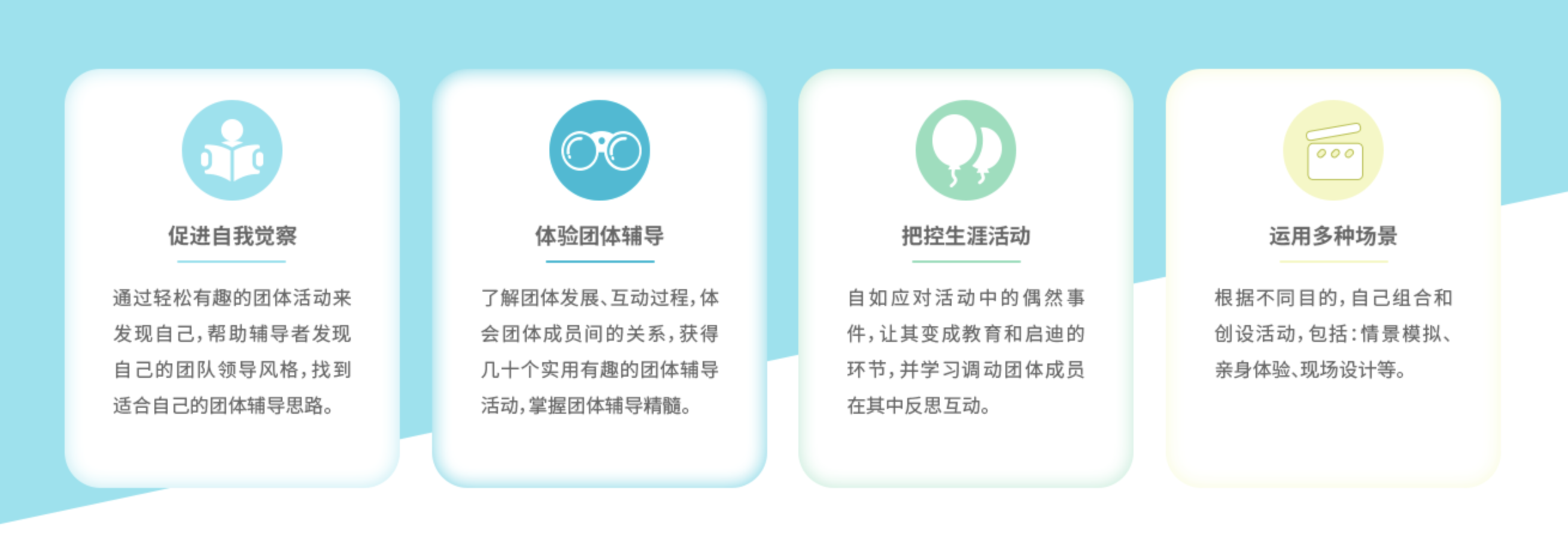 生涯团体辅导培训是由职业生涯领域众多资深讲师和生涯研发团队针对高校教师的需求而研发的精品培训。从酝酿到成型,共历时两年多。该培训通过教授高校生涯辅导教师团体辅导相关基础理论、实操技巧及团体辅导过程演练,结合大学生生涯发展过程中的实际问题,旨在提升生涯辅导教师的团体辅导授课能力、丰富学校生涯教育活动形式。